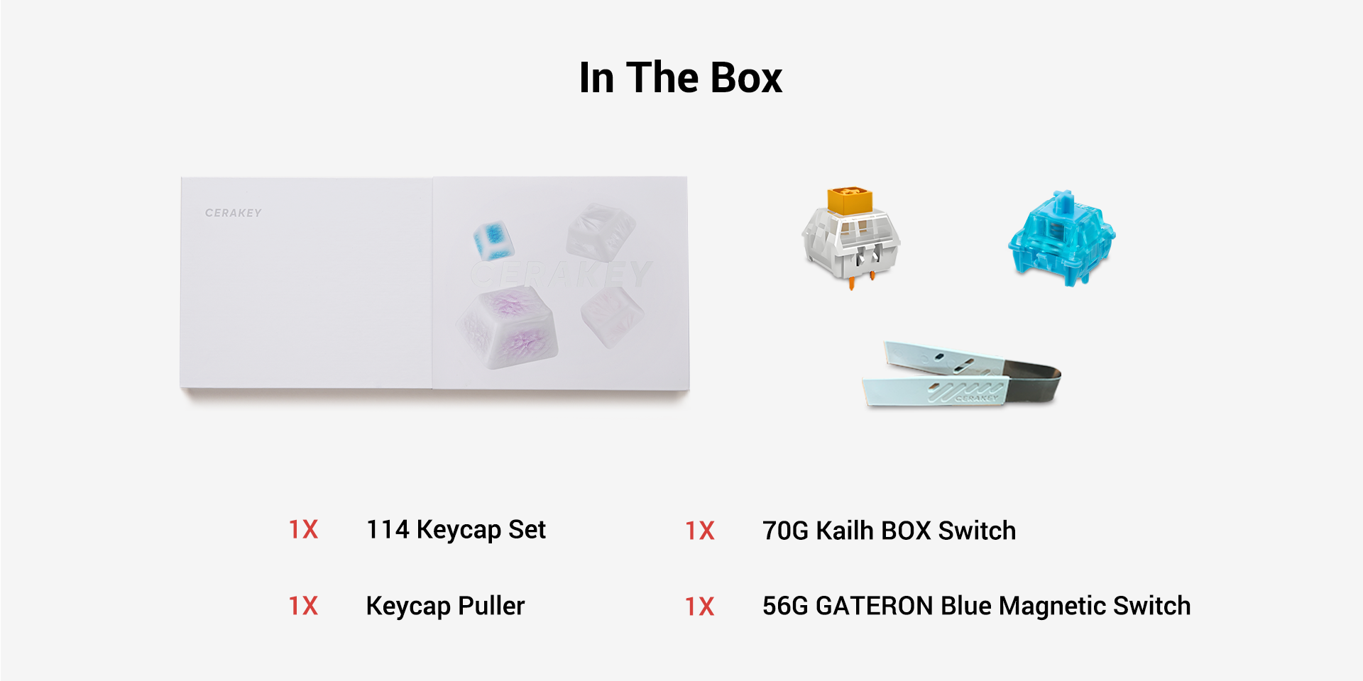 Les touches en céramique Cerakey Ice Crystal Glaze représentent une nouvelle évolution révolutionnaire pour une frappe fluide haut de gamme. Fabriquées en céramique de qualité industrielle avec une texture de cristal de glace exclusive et unique, elles offrent une sensation soyeuse, un toucher ultra-frais et un "thock" mélodieux.