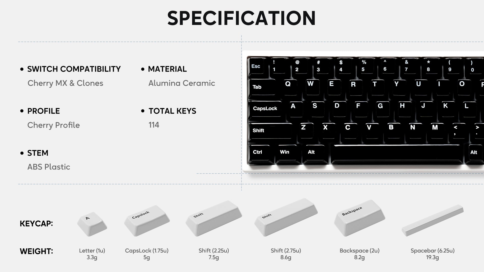 A full 114 keys ceramic keycap set with color & legend options, compatible with Cherry MX switches.