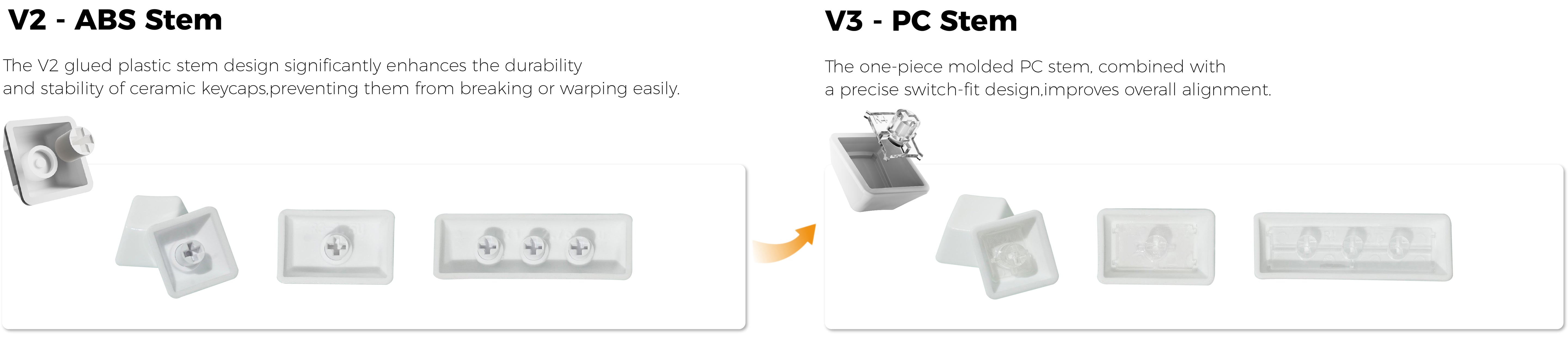 Evolving from the durable V2 ABS stem, the new V3 PC stem is one-piece molded from PC and engineered with switch-specific precision, ensuring perfect keycap alignment and a uniform profile across your entire board.