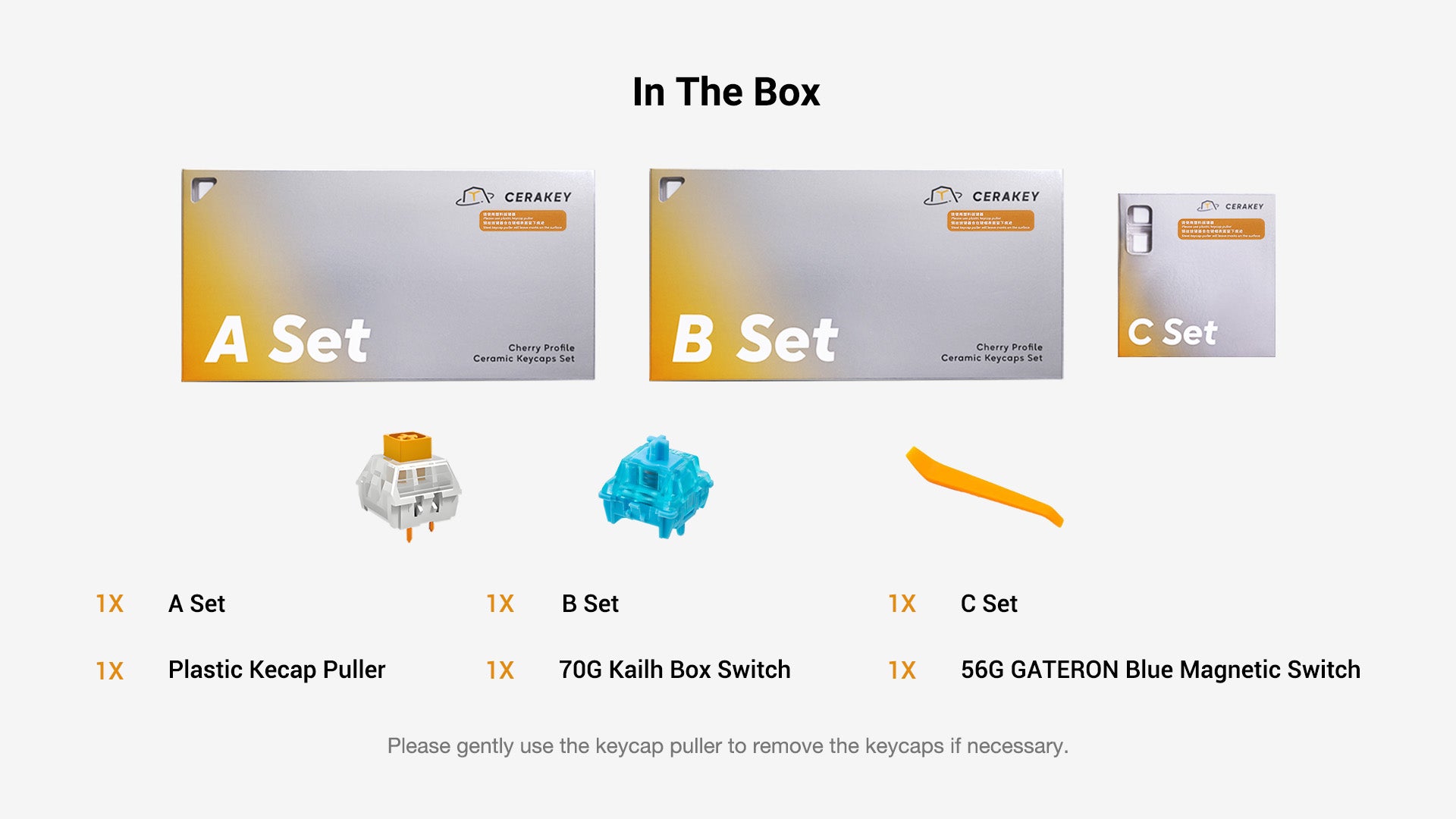 2. If removal is necessary, please use a plastic keycap puller gently. The use of a metal puller may scratch or leave marks on the matte glazed surface.