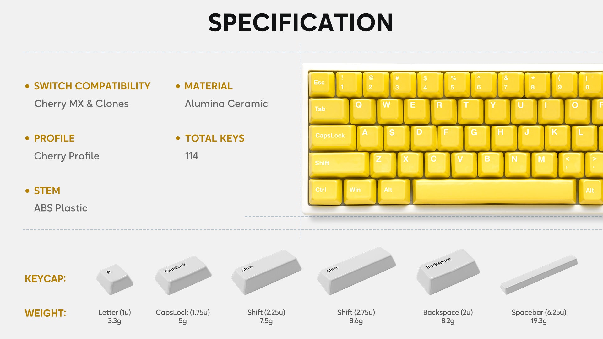 A full 114 keys ceramic keycap set with color & legend options, compatible with Cherry MX switches.