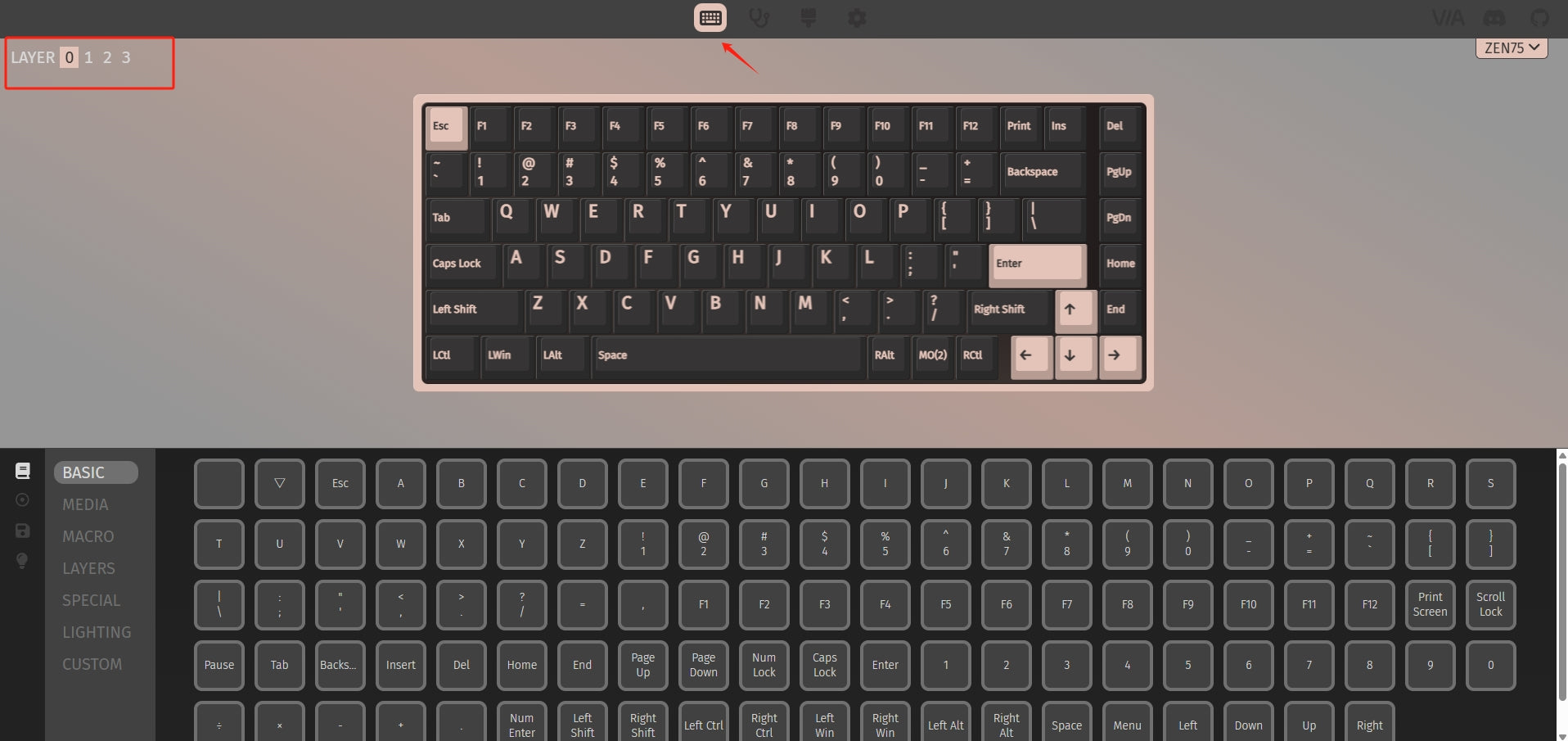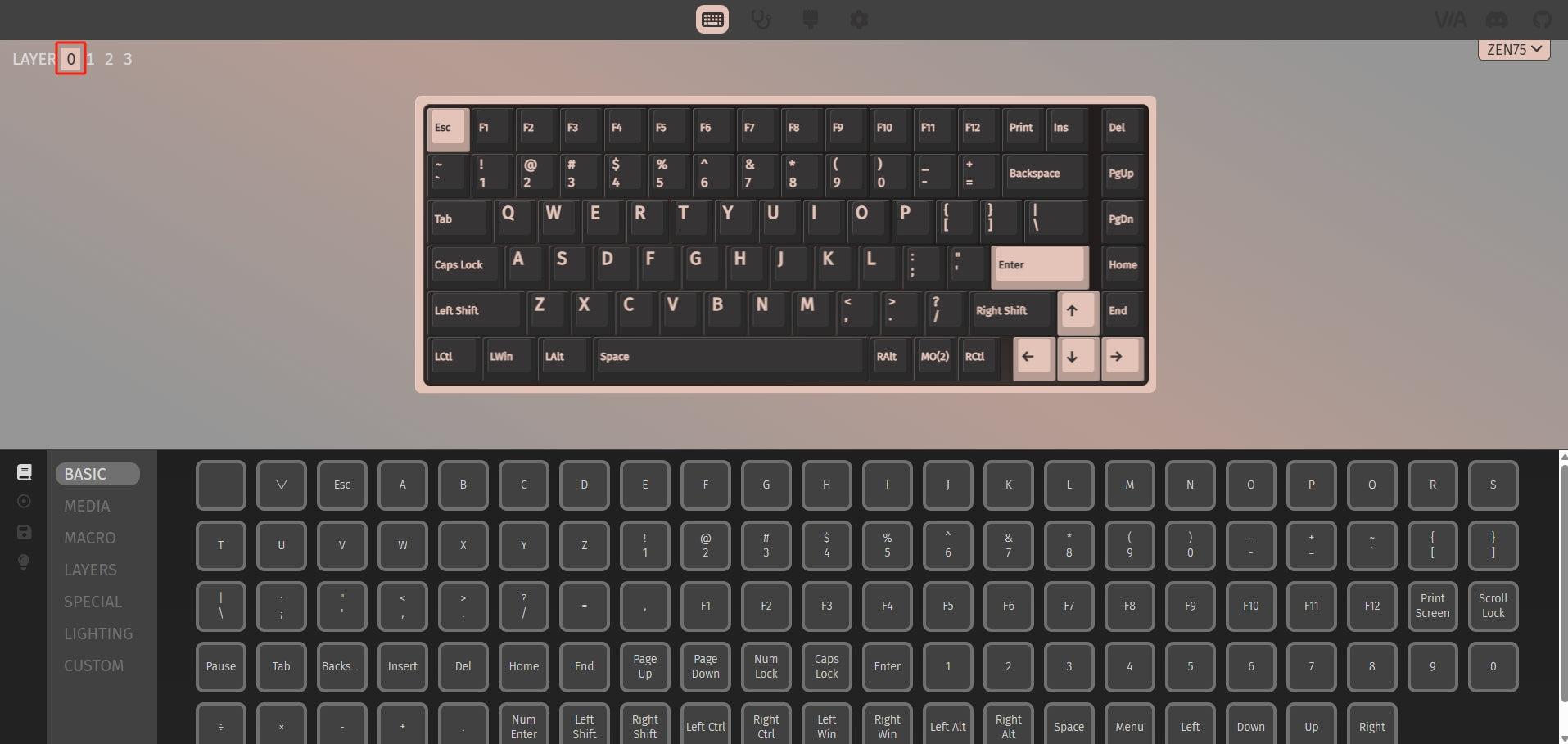 Para visualizar e editar diferentes camadas, clique no botão Layer no canto superior esquerdo. Você pode visualizar apenas uma camada por vez. Sob a aba Configurar, selecione a seção KEYMAP. Clique na tecla que você deseja remapear e escolha entre as seções disponíveis: BÁSICO / MÍDIA / MACRO / CAMADAS / ESPECIAL / ILUMINAÇÃO / CUSTOM