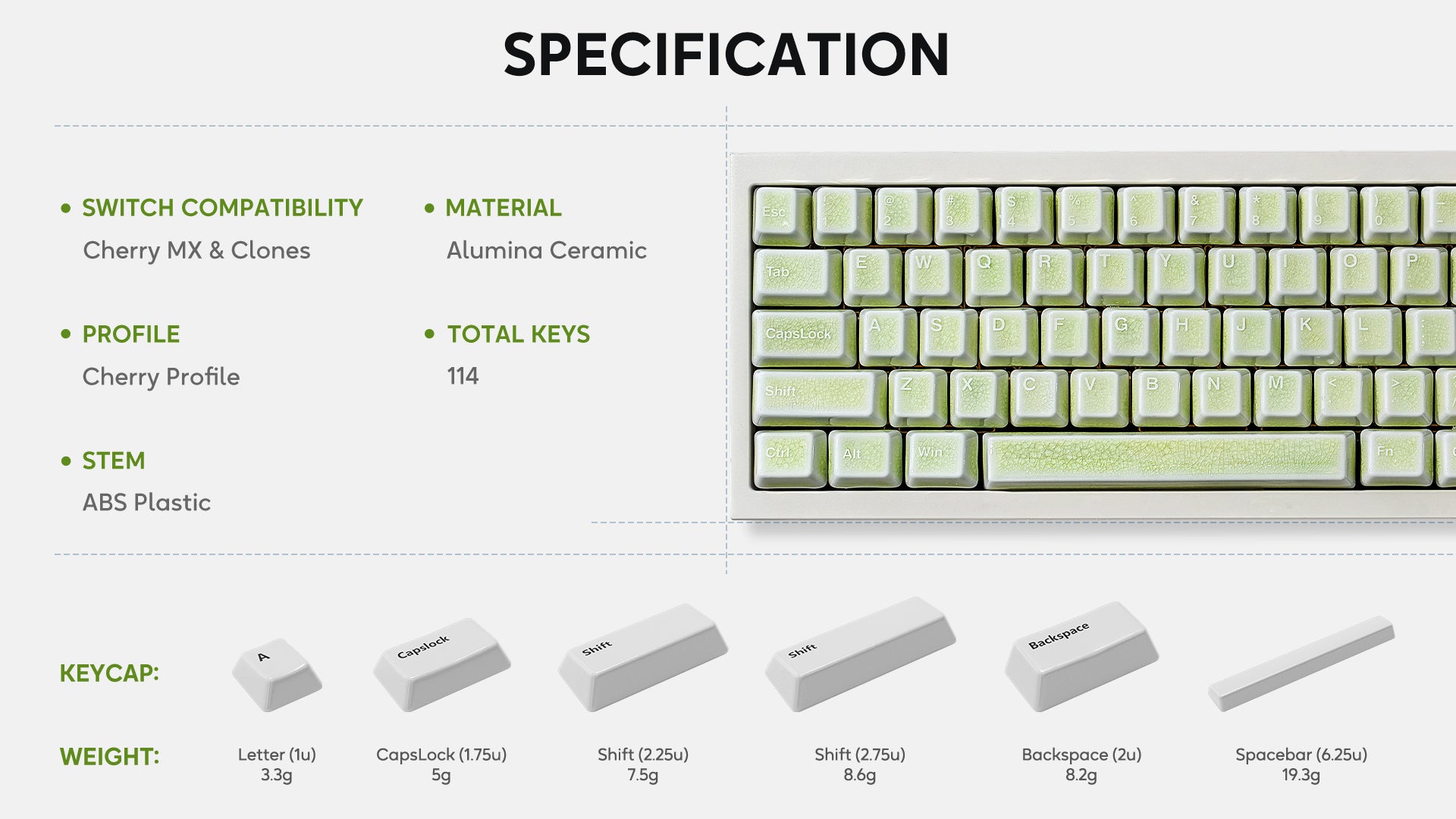 ทำให้การสัมผัสแต่ละคีย์ไหลไปอย่างมีศิลปะและความสง่างาม พร้อมกับเสียงทึบที่น่าฟัง เพื่อทำลายประสบการณ์การพิมพ์ที่น่าเบื่อ ด้วยการพิมพ์บนคีย์แคปเซรามิก ซึ่งเป็นการผสมผสานระหว่างงานฝีมือและเทคโนโลยีที่ทำงานได้อย่างมีสไตล์ ทำจากเซรามิกอะลูมินา คีย์แคปแต่ละชิ้นมอบประสบการณ์การพิมพ์ที่นุ่มลื่นและเสียงทึบ พร้อมตัวเลือกสีเคลือบและสัญลักษณ์หลากหลาย