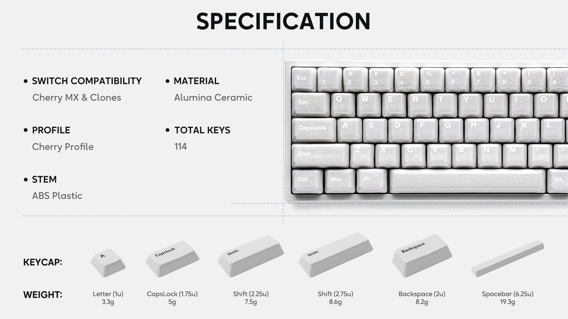 ทำให้การสัมผัสแต่ละคีย์ไหลไปอย่างมีศิลปะและความสง่างาม พร้อมกับเสียงทึบที่น่าฟัง เพื่อทำลายประสบการณ์การพิมพ์ที่น่าเบื่อ ด้วยการพิมพ์บนคีย์แคปเซรามิก ซึ่งเป็นการผสมผสานระหว่างงานฝีมือและเทคโนโลยีที่ทำงานได้อย่างมีสไตล์ ทำจากเซรามิกอะลูมินา คีย์แคปแต่ละชิ้นมอบประสบการณ์การพิมพ์ที่นุ่มลื่นและเสียงทึบ พร้อมตัวเลือกสีเคลือบและสัญลักษณ์หลากหลาย