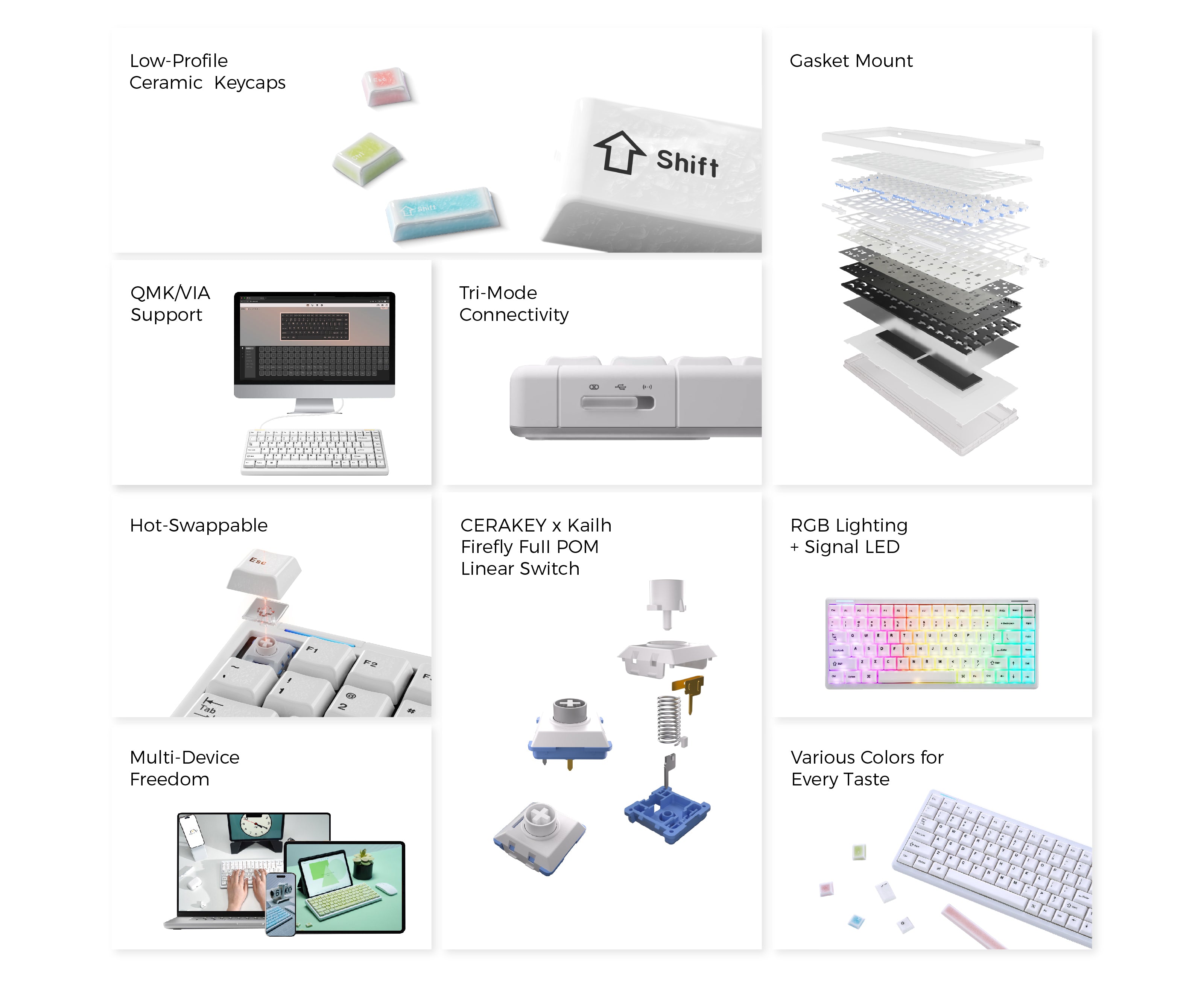 The ZEN75 is a compact 75% keyboard featuring unique ceramic keycaps and a gasket mount for a thocky sound. Equipped with Kailh Firefly POM linear switches, it offers a smooth, premium typing experience perfect for both work and play.
