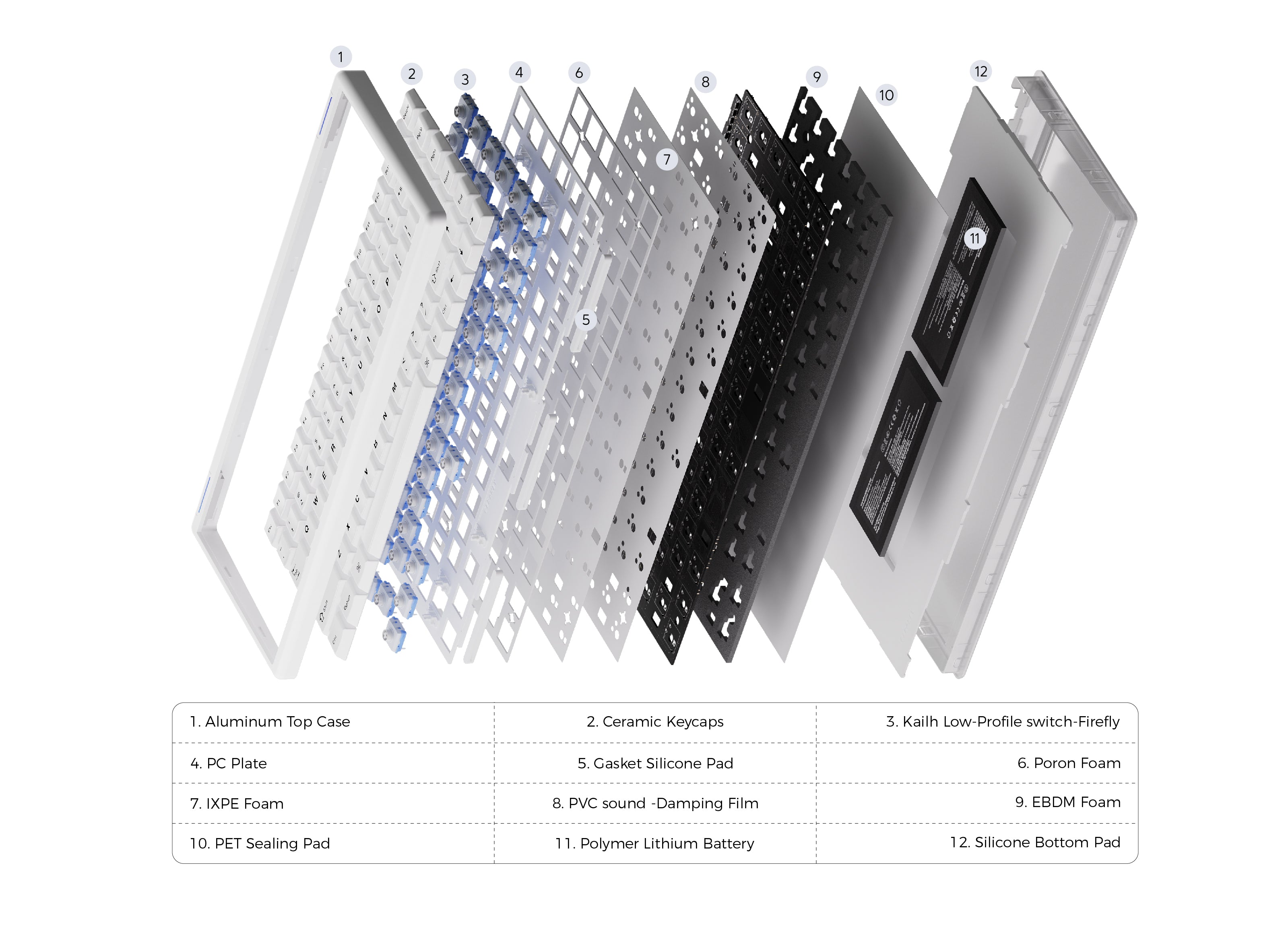 The Zen75 adopts a gasket mount structure, paired with multi-layer foams (IXPE, Poron, EBDM) and a PVC sound-damping film. This setup cushions switch vibrations for smoother, more responsive keystrokes, cuts unwanted noise.